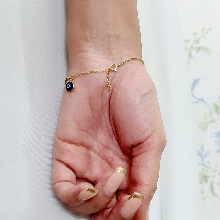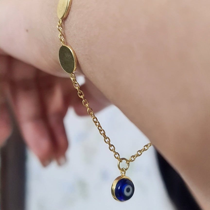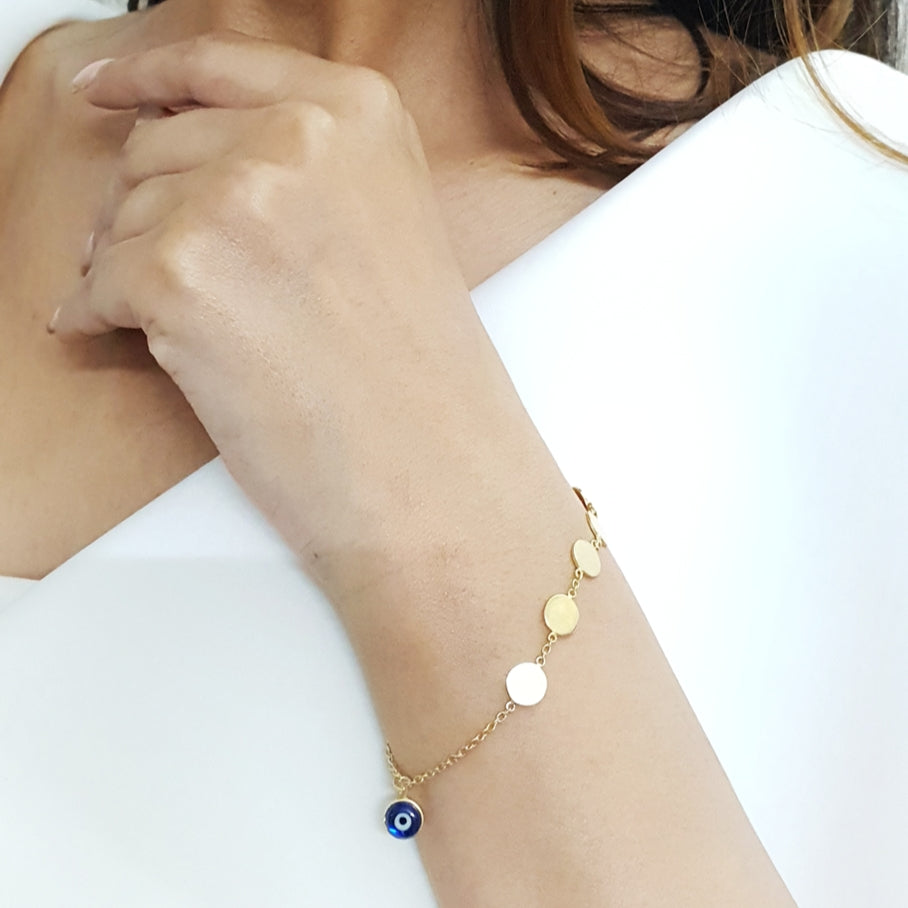 A dangling evil eye combined with round high polished discs to add a touch of modernity to your look.