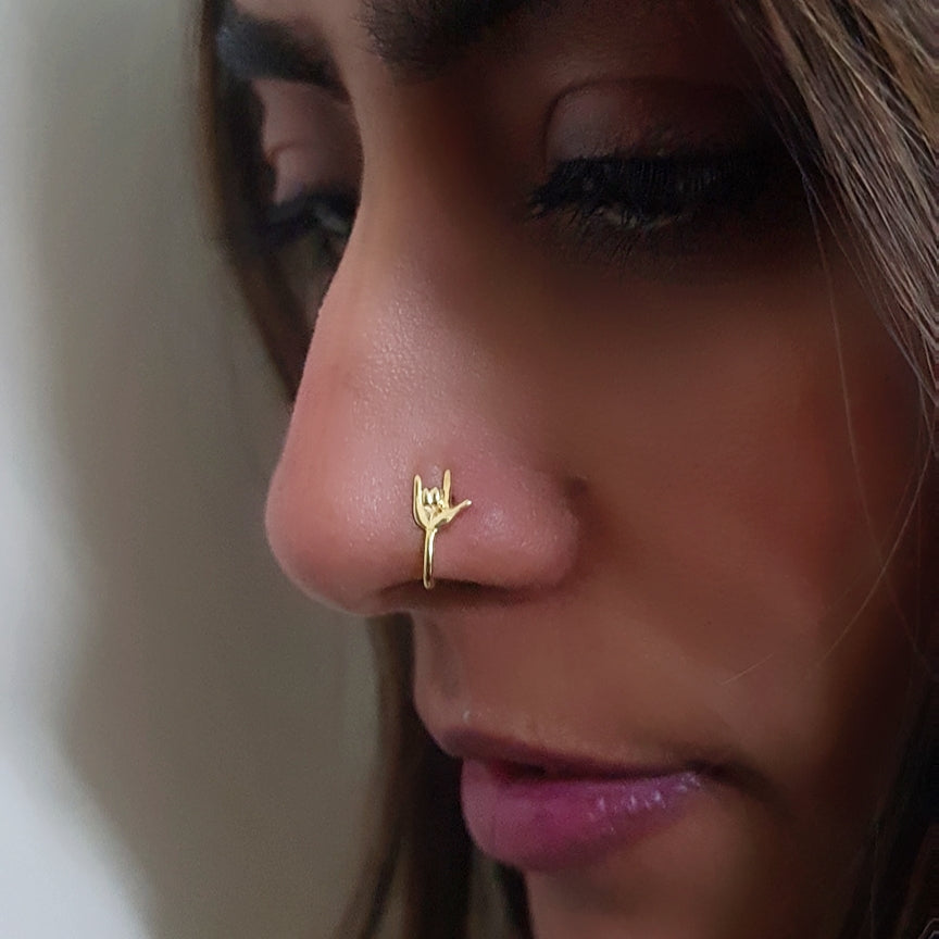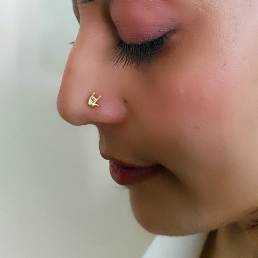 Spread some love with "I Love You" hand emoji nose pin- perfect to add some style and fun to your wardrobe.